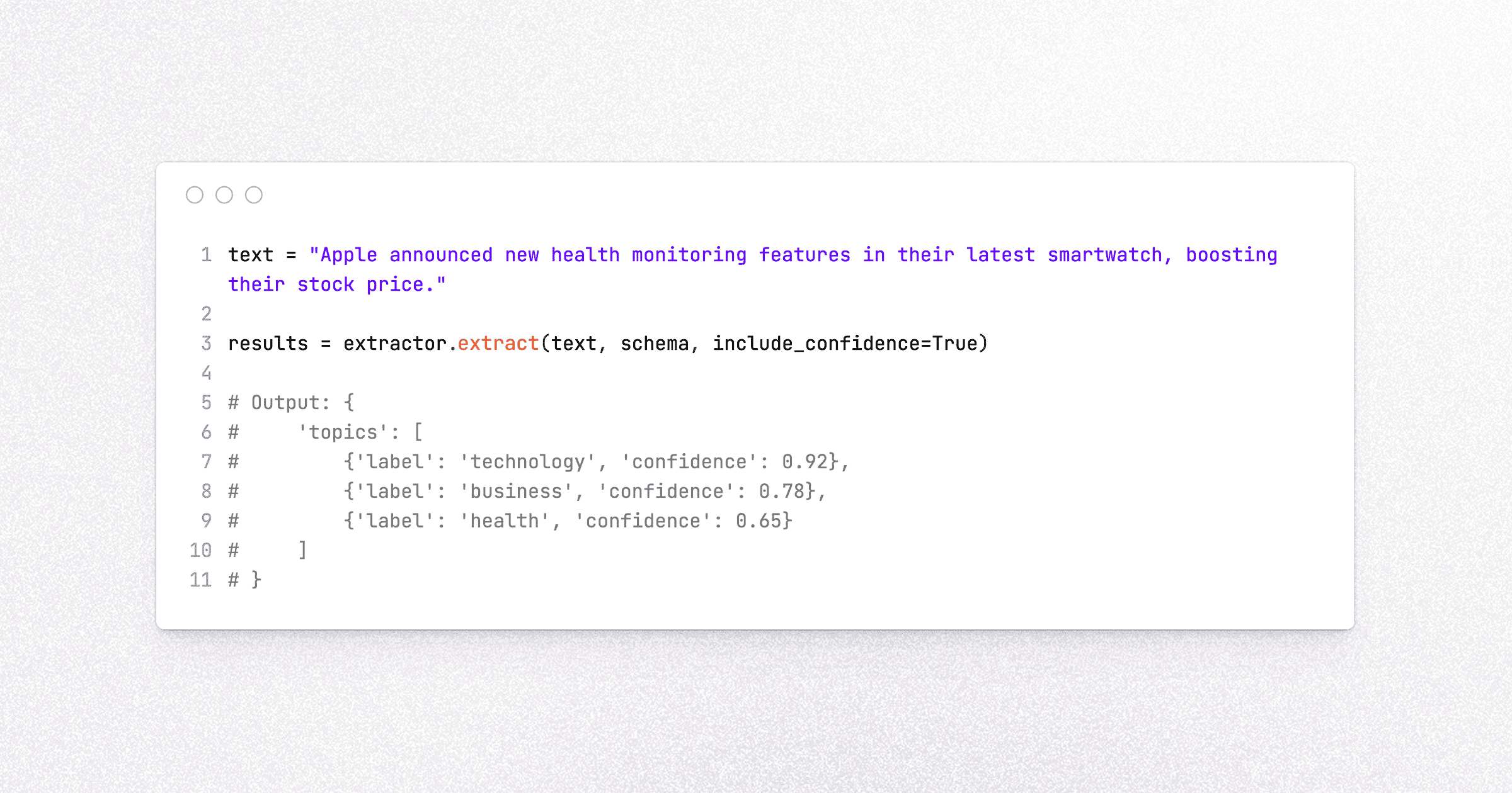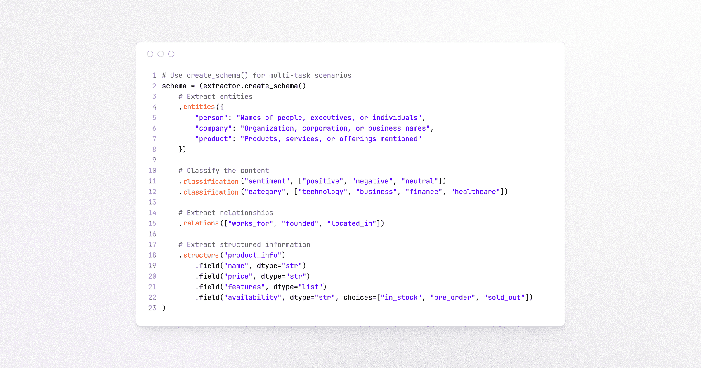 • Reliable structured outputs. Using encoder models also means no fighting with the model to produce structured outputs and adhere to a fixed schema. The output format for all GLiNER2 tasks is predefined.